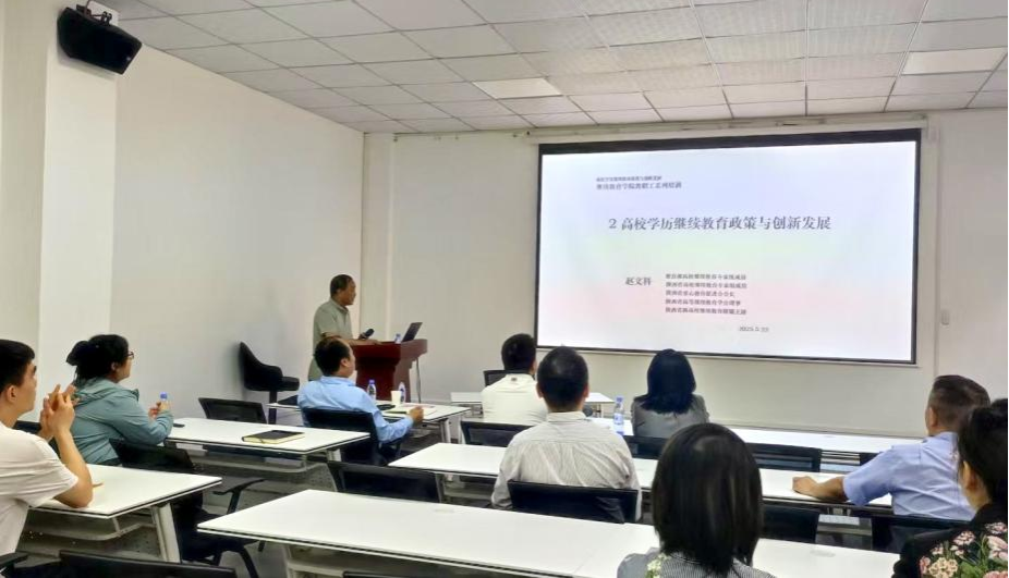 2025年5月22日,明陞m88官方网站特邀陕西省属高校继续教育联盟主席赵文科开展“高校学历继续教育政策与创新发展”专题培训讲座,面向全院教职工深入解析新时代继续教育政策要求与办学创新方向,培训会由经理张刚主持。